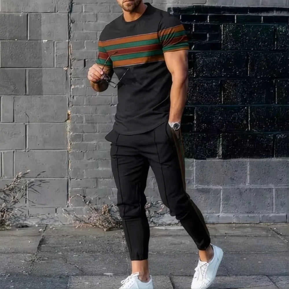 Step up your game and style with this hot-selling summer 2-piece set, designed for men who move with confidence — both on and off the court. This retro-inspired outfit includes a 3D-printed short-sleeved T-shirt and matching comfortable jogger-style pants, perfect for workouts, casual outings, or chilling in style.